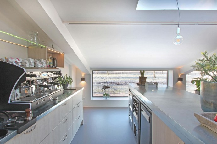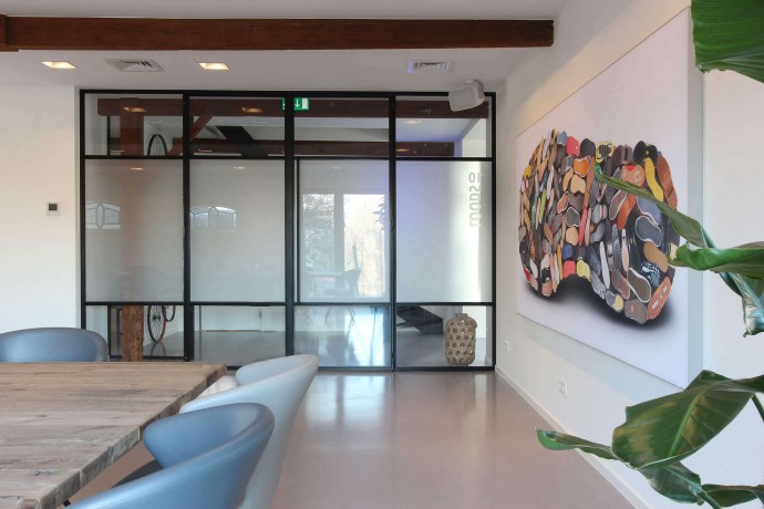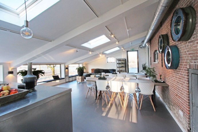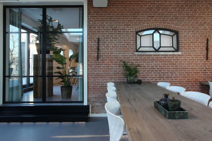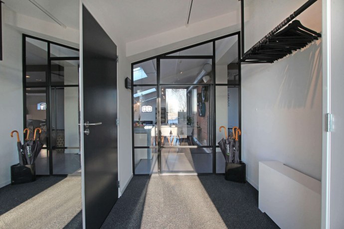 Het interieur is zeer open gehouden middels een aantal mooie stalenpuien die de verschillende ruimtes afsluiten. Daarnaast zijn binnen een aantal details gehandhaafd, waaronder de houten gebinten, de gemetselde muur (met een koppen en strekken verband), de varkensdeur en het inpandige stalraam.