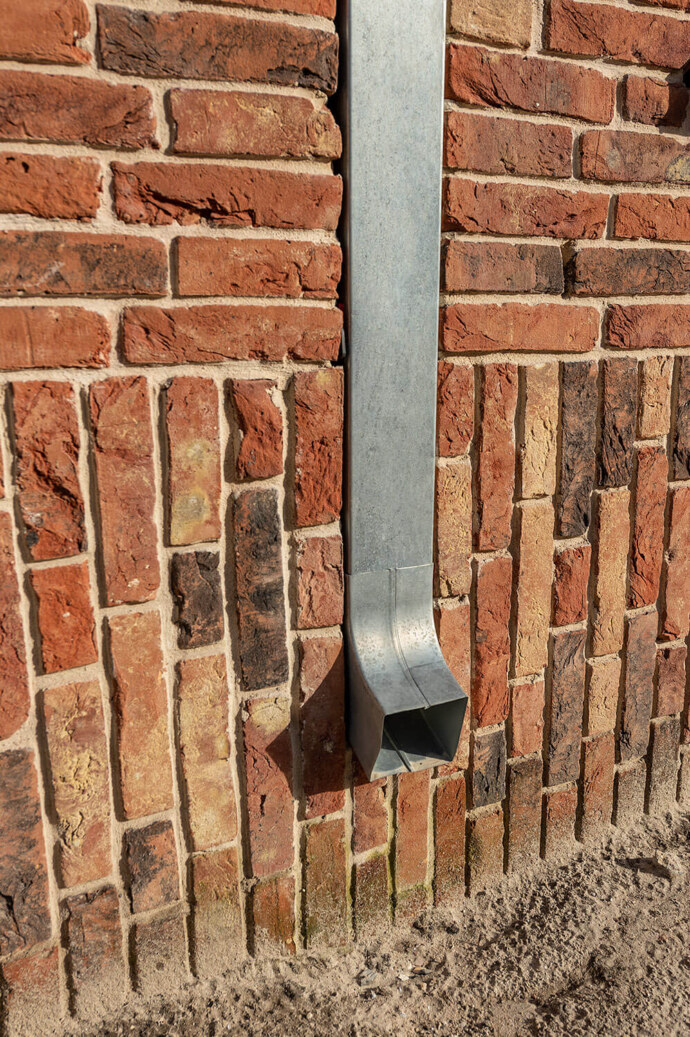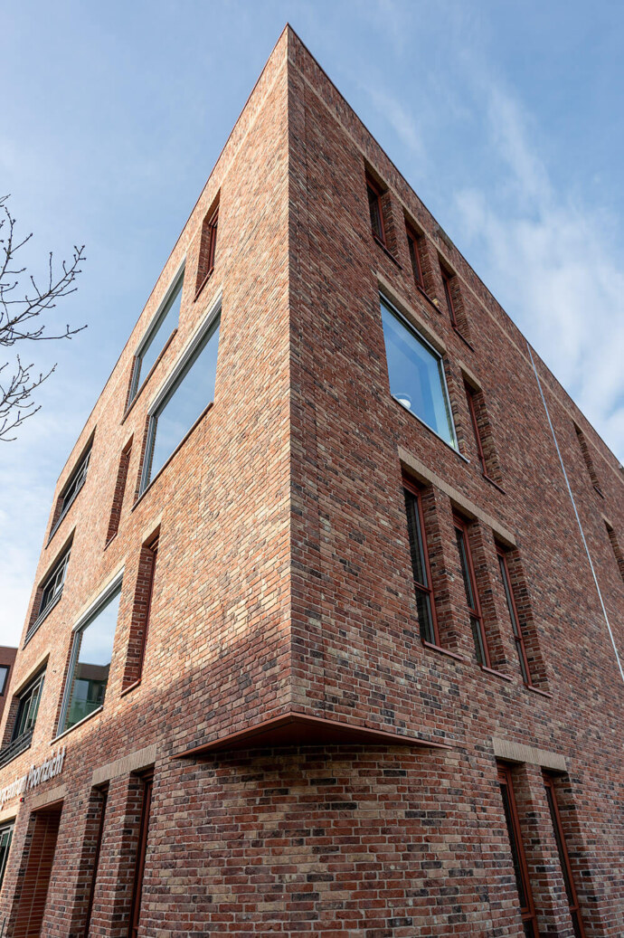 Het metselwerk bestaat uit een fraaie gemêleerde bruin/beige/oranje/grijze steen, en wordt verrijkt met metselwerkverbanden. De HWA’s worden terug liggend geplaatst in het metselwerk. Naast dat de raamopeningen anders van maat zijn, en met verschillende neggedieptes zijn ontworpen, worden ze ook in een andere kleur uitgevoerd, smalle ramen donkerder dan de grote puien, hierdoor wordt de diepte werking extra aangezet.