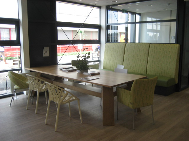De receptiebalie die direct bij binnenkomst zichtbaar is, is een belangrijk object in de ruimte en is ontworpen als één balie, waarbij de twee verschillende gebruikers, goed zichtbaar, hun eigen receptiepunt hebben. De wachtruimte is ingericht als een prettige ruimte met een grote (lees)tafel met daar om heen verschillende stoelen en een treinzit, zodat alle cliënten, ook degene in een rolstoel, overal kunnen aanschuiven.